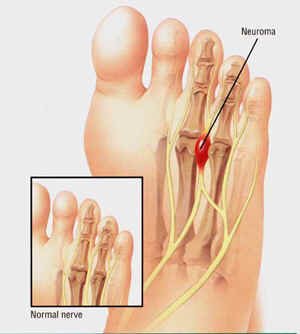 Runners may feel pain as they push off from the starting block. High-heeled shoes, which put the foot in a similar position to the push-off, can also aggravate the condition. Tight, narrow shoes also aggravate this condition by compressing the toe bones and pinching the nerve.